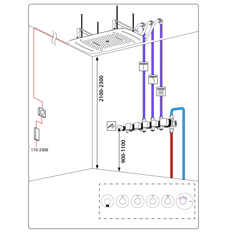 | Дополнительная информация | Встраиваемый блок управления душевой системой (латунный) - 1 шт. Корпус потолочного душа (латунный) - 1 шт. Душевая панель (латунная) 680*430 мм - 1 шт. Винты с гайками для крепления подвесных кронштейнов (комплект) - 4 шт. Держатель ручной лейки с подключением душа (латунный) - 1 шт. Подвесные кронштейны - 2 шт. Подводка к тропическому душу - 3 шт. Ручка дивертора - 4 шт. Ручка управления термостатом - 1 шт. Декоративные накладки с гильзами (комплект) - 6 шт. Ручная лейка (латунная) - 1 шт. Соединительная трубка для подключения ручного душа - 1 шт. Шланг душа 1,5 м - 1 шт. Блок управления подсветкой - 1 шт. Инвертор (преобразователь тока) - 1 шт. Т-образный соединитель проводов - 1 шт. Скрытый провод - 1 шт. Провод блока управления подсветкой - 1 шт. Инструкция - 1 шт. |