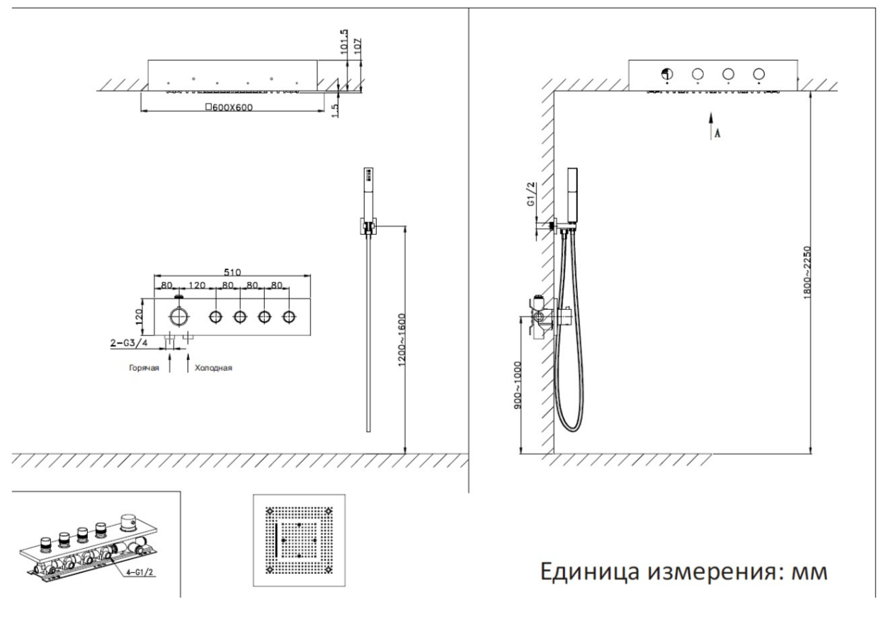 | Комплектация | встраиваемый механизм / термостатический смеситель настенного монтажа / латунный двухрежимный ручной душ / гибкий полимерный шланг / латунный мультифункциональный верхний душ / установочный комплект |