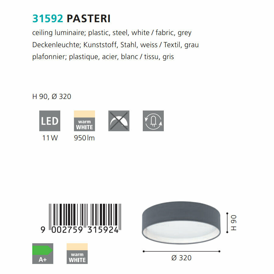 31592 Светодиодный светильник потолочный PASTERI, 12W (LED), ?320, белый/текстиль, серый