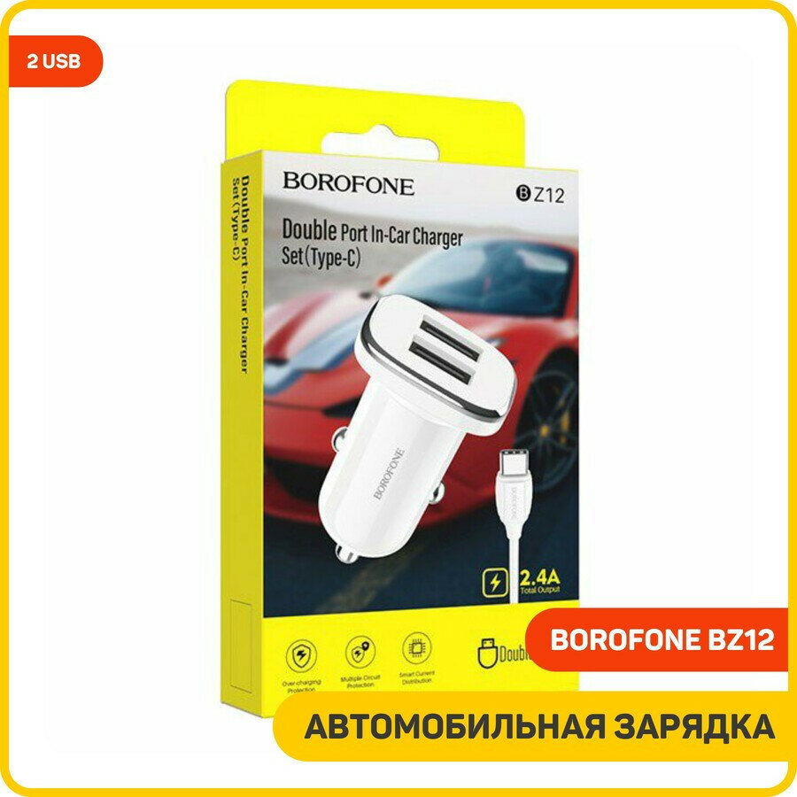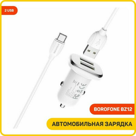 Купить Автомобильное зарядное устройство BOROFONE BZ12 Lasting Power, 2.4A + кабель USB Type-C, 1м, белый