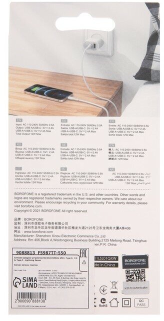 Сетевое зарядное устройство Borofone BA62A, USB + Type-C, 2.4 А, Type-C - Lightning, белое интересное:
