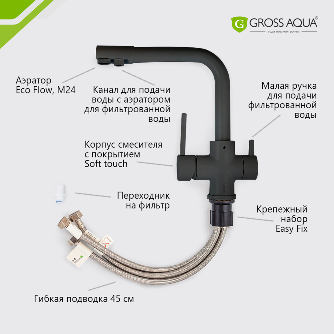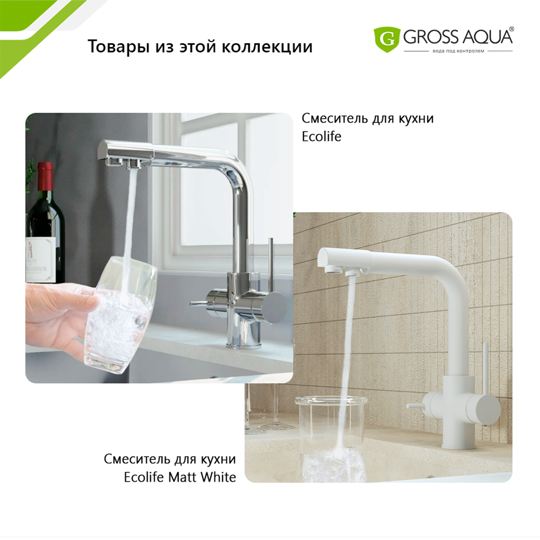 Смеситель для кухни с подключением к фильтру воды GROSS AQUA Ecolife, латунь, хром, 3120609MB. интересное: