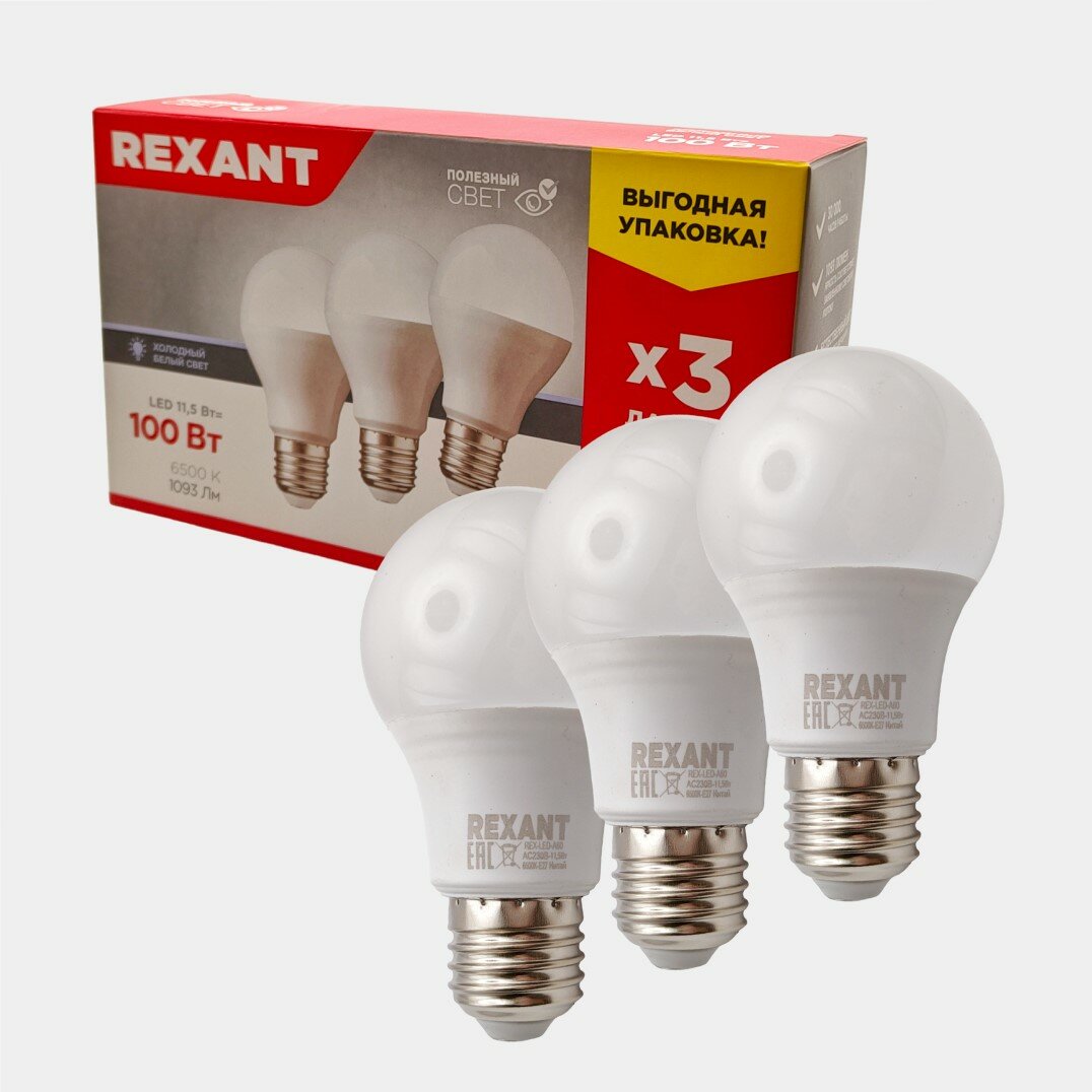 Светодиодная лампа REXANT Груша E27, 11.5 Вт, A60, 1093 Лм (=100 Вт), 6500 K (холодный свет), упаковка 3 шт.