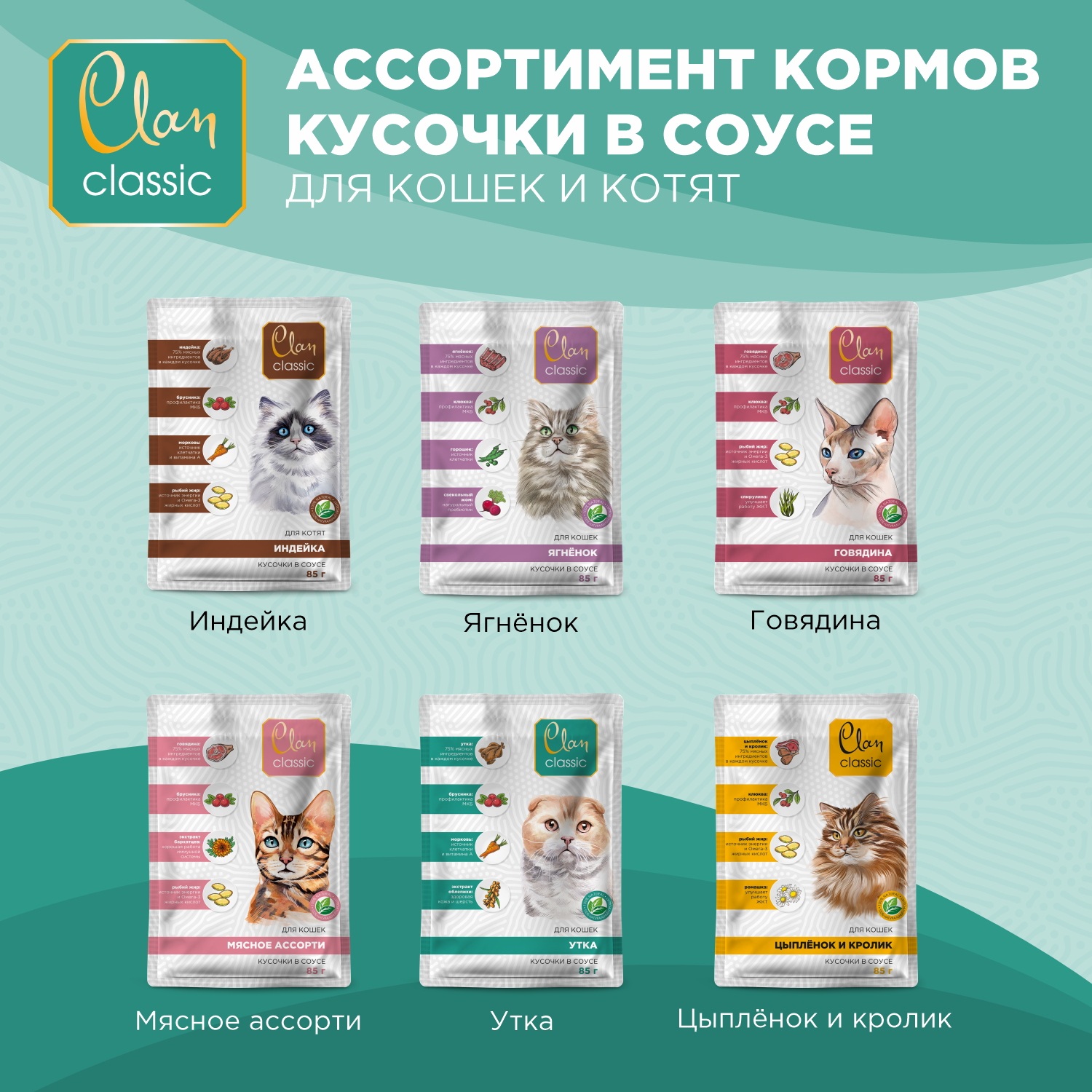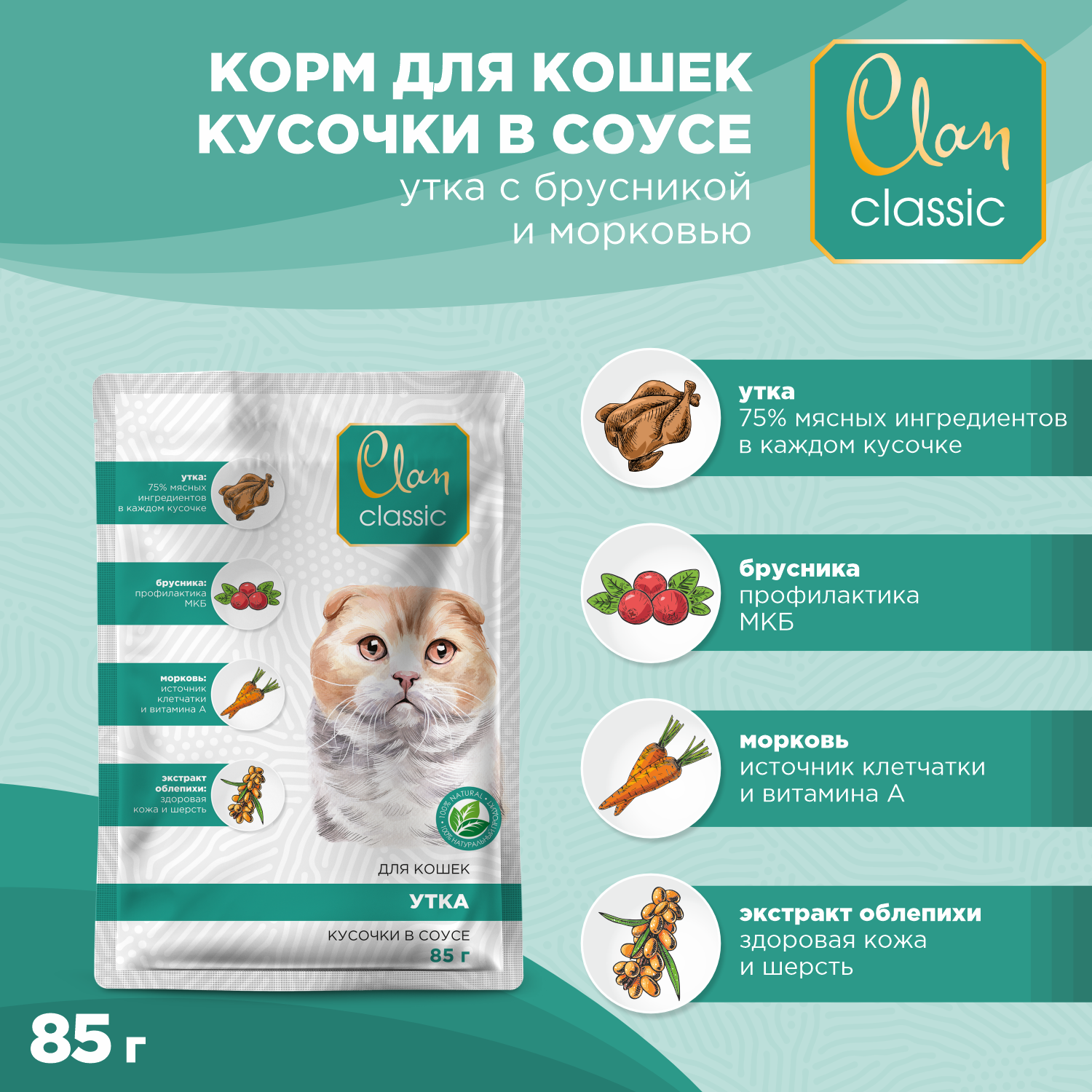 Купить Влажный корм Clan CLASSIC для кошек, утка с брусникой и морковью, кусочки в соусе, 14шт*85г