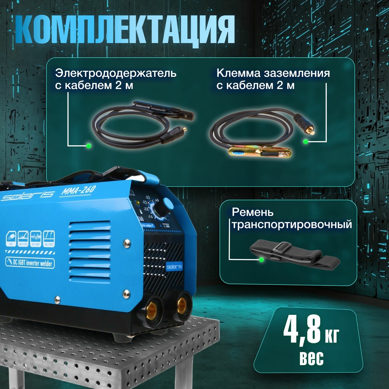 Инвертор сварочный SOLARIS MMA-260 (230В; 20-250 А; 69В; электроды диам. 1.6-5.0 мм; вес 4.3 кг) интересное: