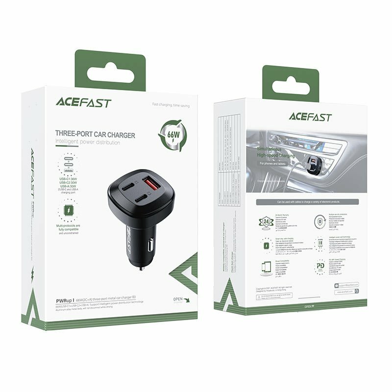 Купить Автомобильное быстрое зарядное устройство ACEFAST B3 66W (USB-C+USB-C+USB-A) three-port, металлическое, черный