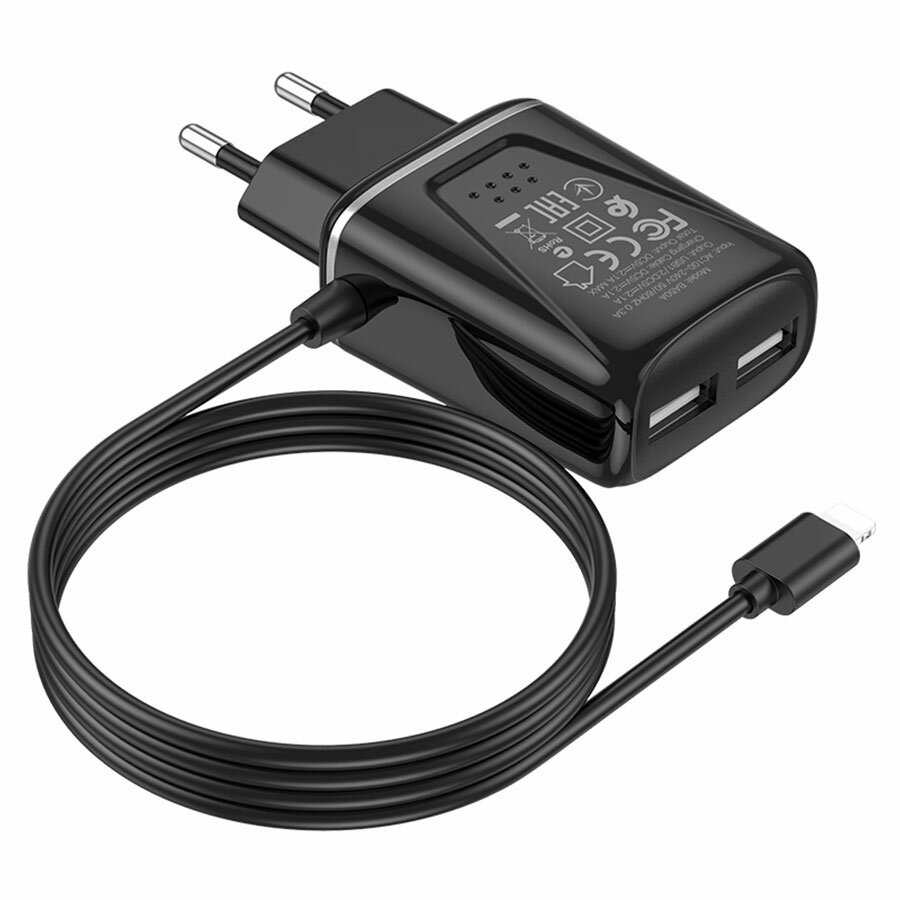 Блок питания сетевой 2 USB Borofone, BA50A, Beneficence, 2400mA, пластик, кабель Apple 8 pin, цвет: чёрный