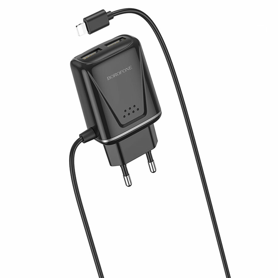 Сетевое зарядное устройство (СЗУ) Borofone BA50A (2 USB) + кабель Lightning, 2.1 А, черный