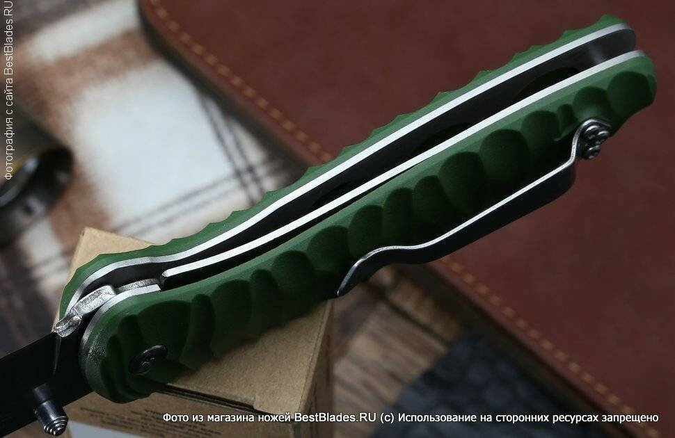 ?? Материал рукоятки стеклотекстолит G10, материал лезвия сталь D2 (твердость 58 HRC); ?? Нож имеет крюк-вейв, который ускоряет время выкидывания лезвия; ?? Бекспейсер также выполнен из G10, на его тыльной части находятся насечки под большой палец для обратного хвата; ?? Спуски плоские и высокие с равномерным сведением около 0,5 мм. по всей длине; ?? Замок лайнер-лок. |