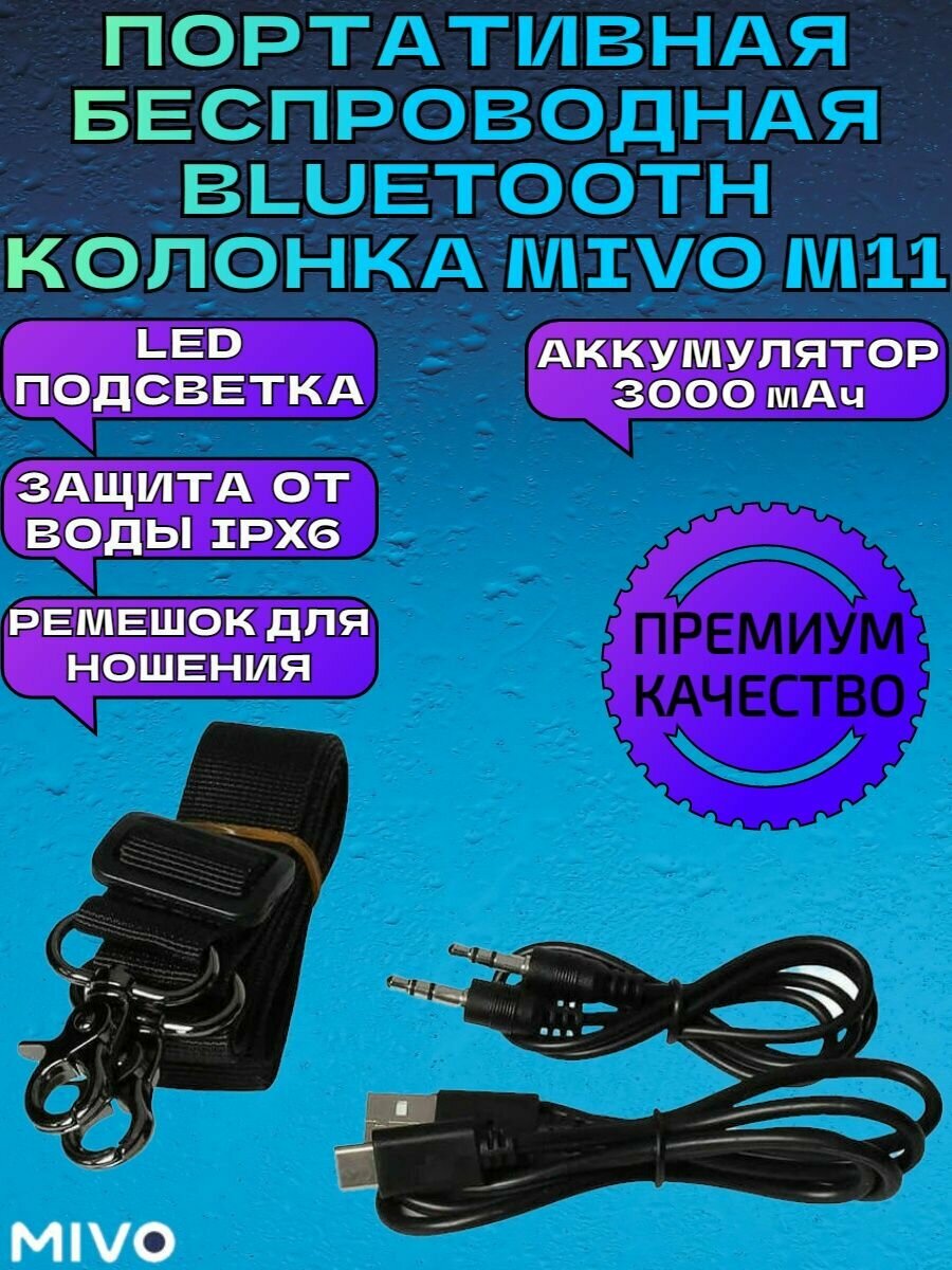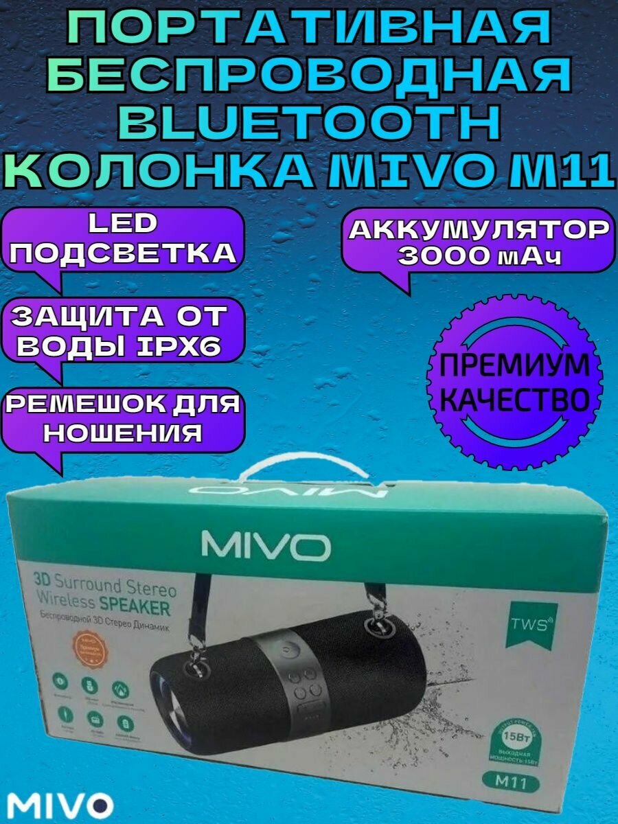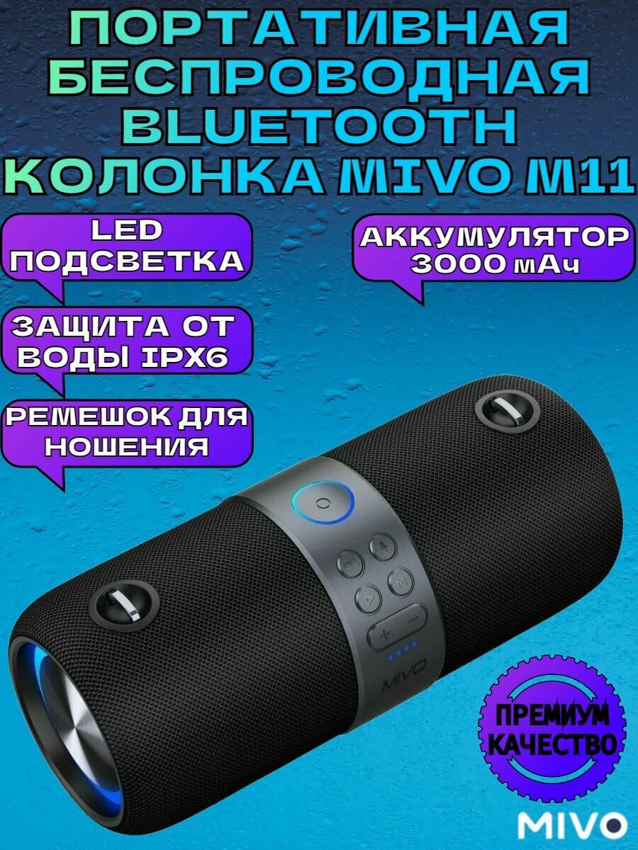 Портативная беспроводная колонка Mivo M11/Bluetooth/FM-радио/3D с LED-подсветкой/USB, micro-SD