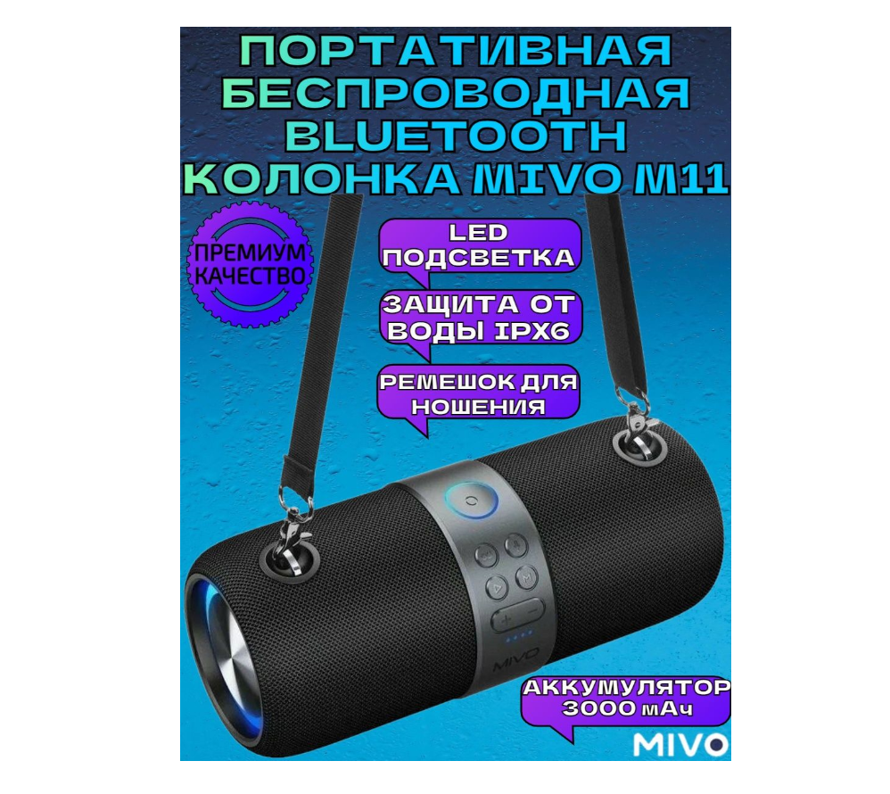 | Дополнительная информация | Комплектация: Колонка MiVO M11, плечевой ремень, кабель-АUX, кабель зарядки USB-A на type-C. |
