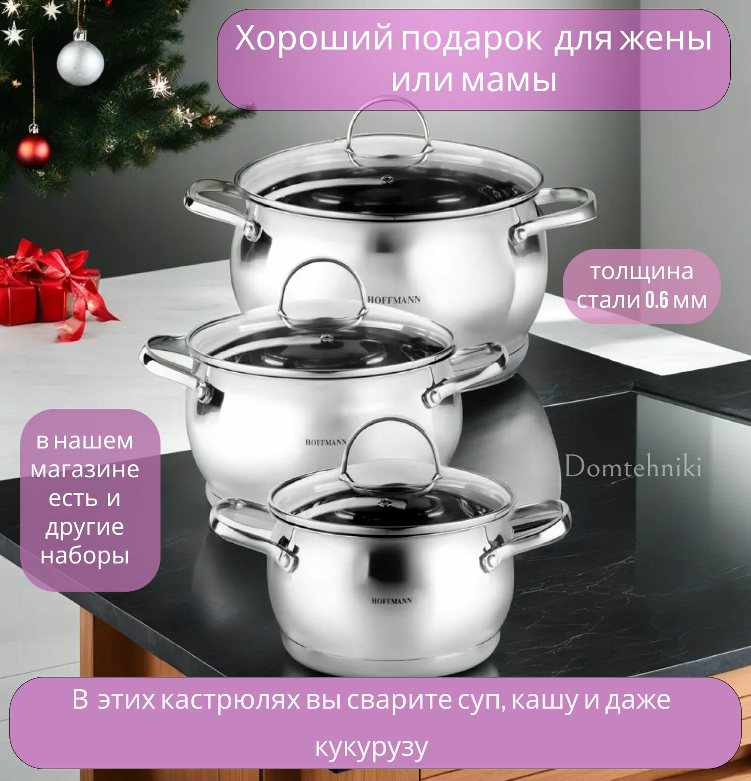 Набор кастрюль, Кастрюля Hoffmann, Посуда для кухни кастрюли набор из нержавеющей стали для индукционных и других видов плит 2,1л, 3,9л, 6,7л.