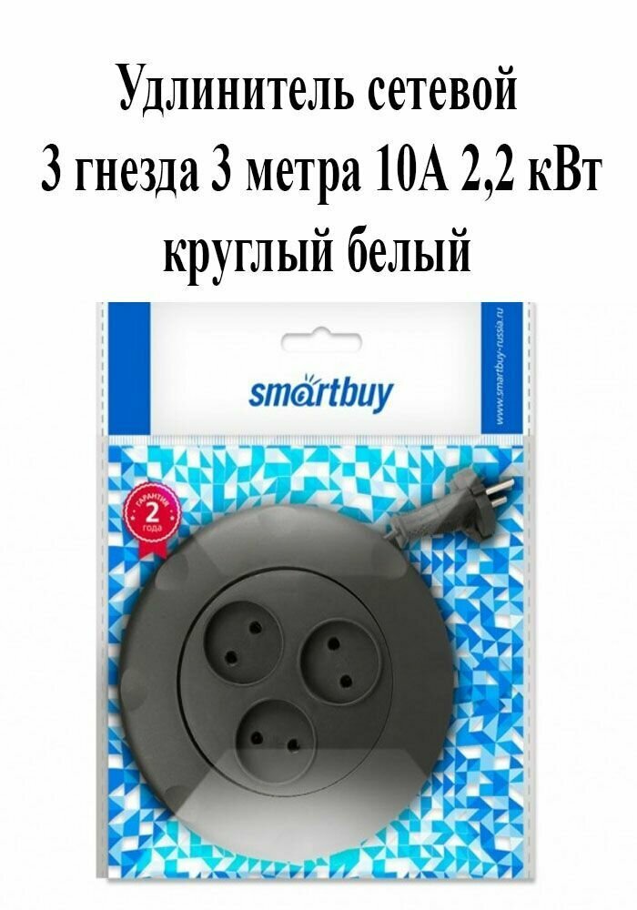 Удлинитель бытовой 3 гн, 3 м, ПВС, 2х1 мм2, б/з, 2200 Вт, бел, Smartbuy, SBE-10-3-03-W