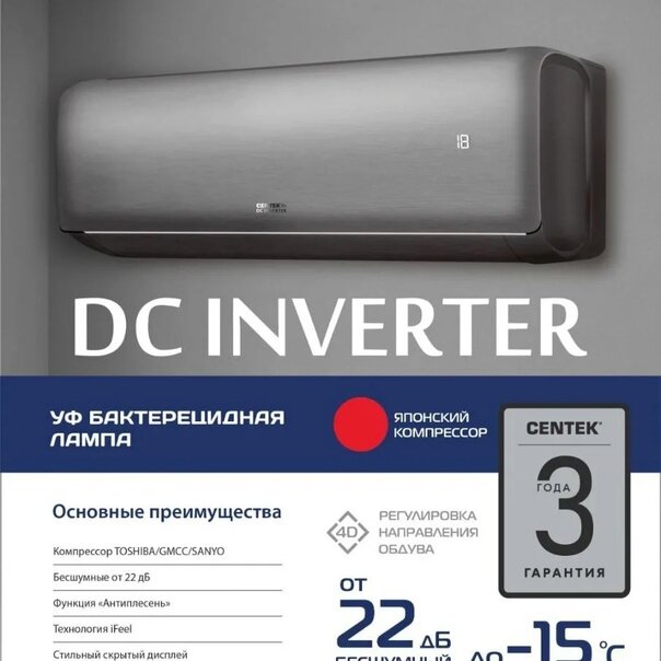 Сплит-система CENTEK CT-65I09 инвертор (серый) <2840/2920W> 4D обдув, 4 фильтра, УФ лампа, R32, A++ интересное: