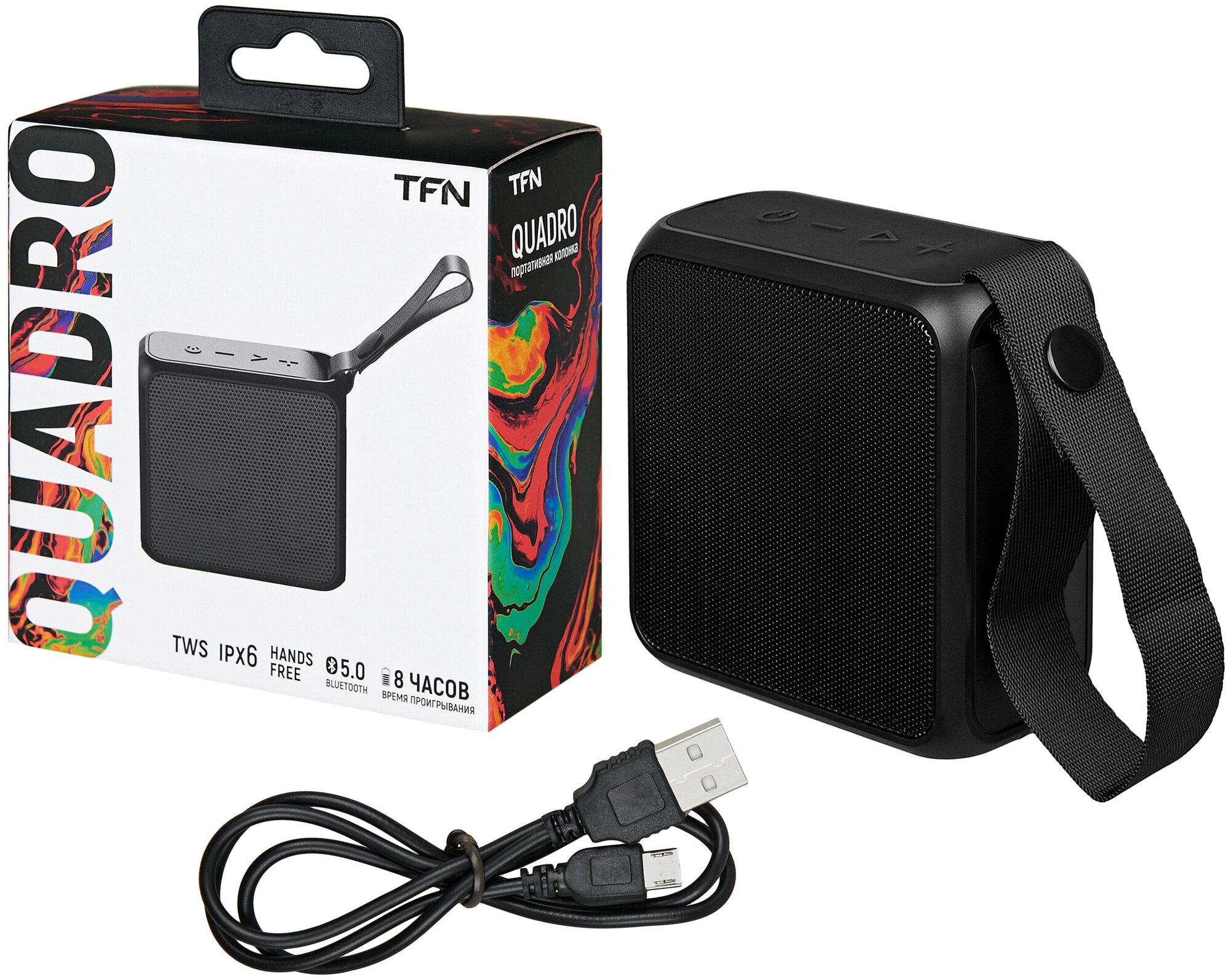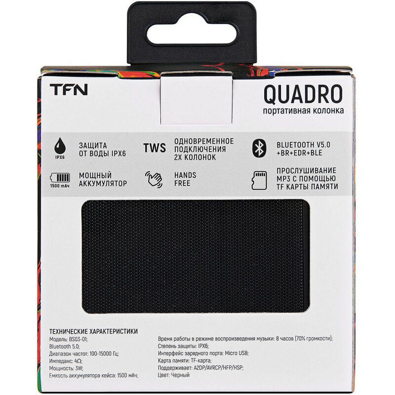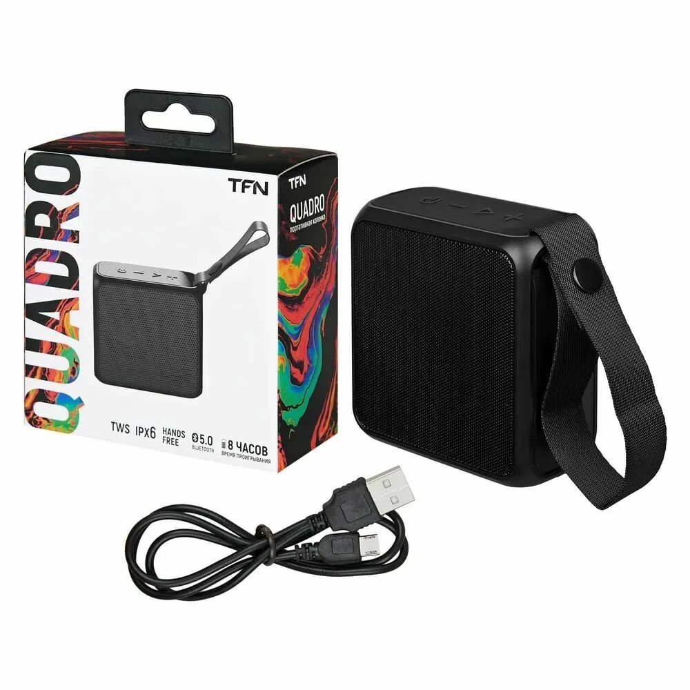 Портативная колонка TFN Quadro, 3Вт, Bluetooth 5.0, microSD, microUSB, IPX6, 1500мАч, черная