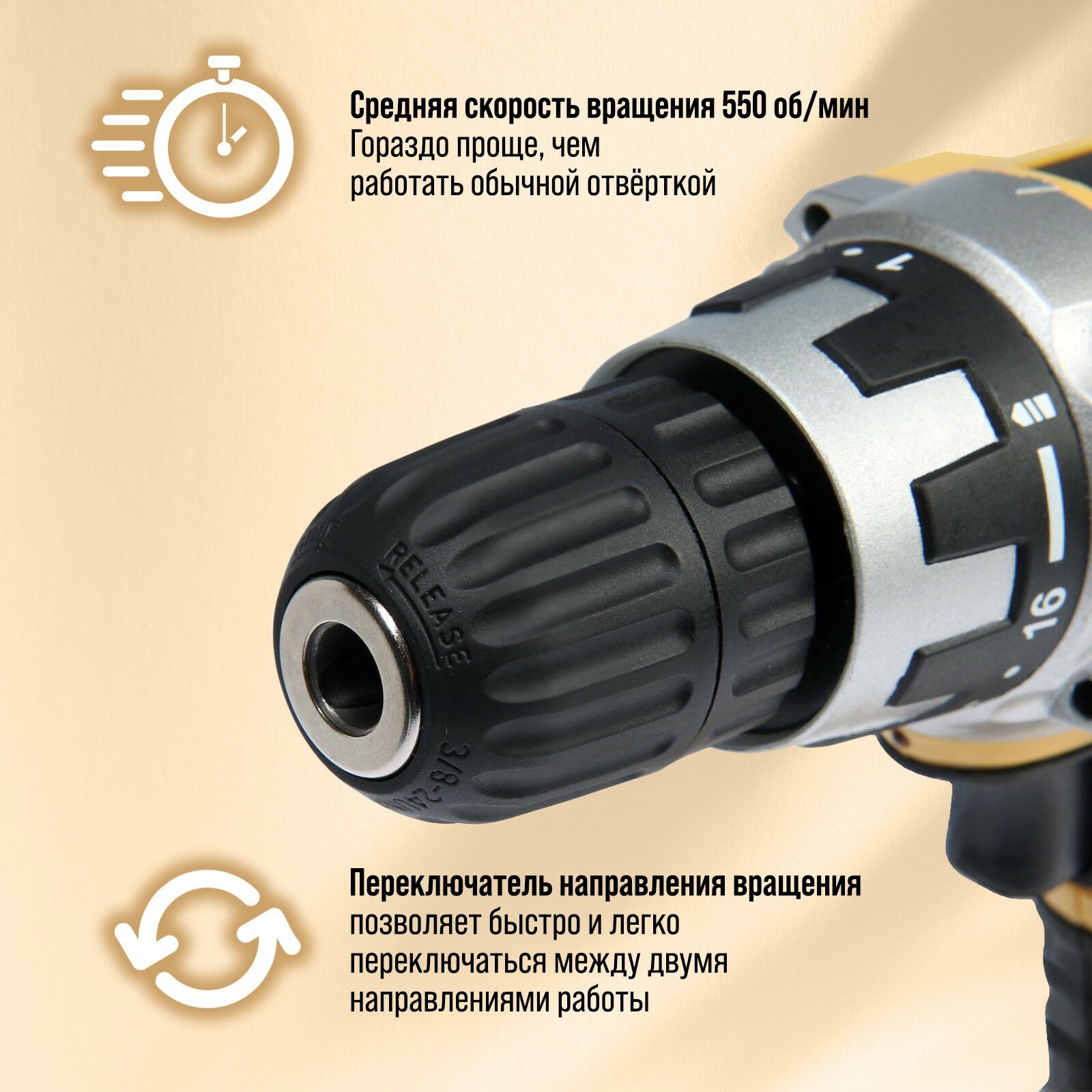 Шуруповерт, патрон БЗ до 10 мм, подсветка, Li-ion 1300 mAh 16V, 550 об/мин, 24 Н*м