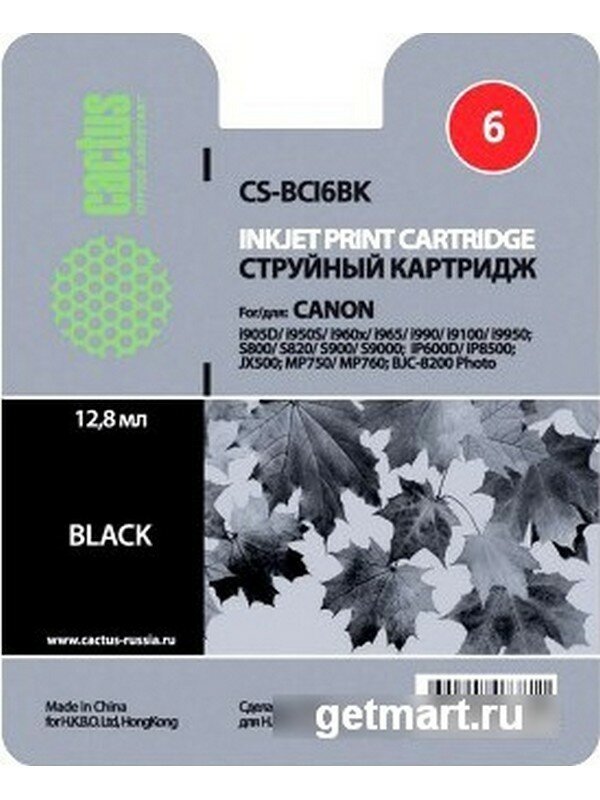Картридж струйный Cactus CS-BCI6BK черный (12мл) для Canon i905D/i950S/i960x/i965/i990/i9100/i9950/S800/S820/S900/S9000/iP600D/iP8500/JX500/MP750/MP760/BJC-8200