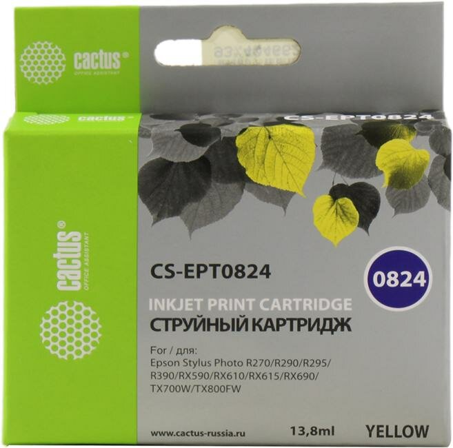 Картридж Cactus CS-EPT0824, совместимый, желтый, для Epson Stylus Photo R270 / R290 / R295 / R390 / RX590 / RX610 / RX615 / RX690 / T50 / T59 / TX650 / TX659 / TX700W / TX710W / TX800FW