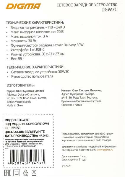 Сетевое зарядное устройство Digma DGW3C0F010WH