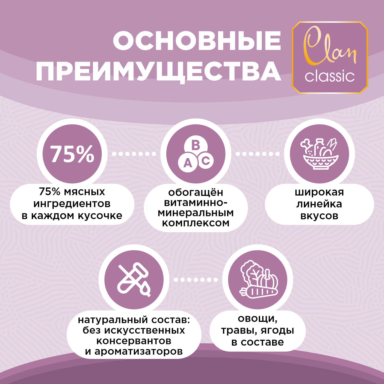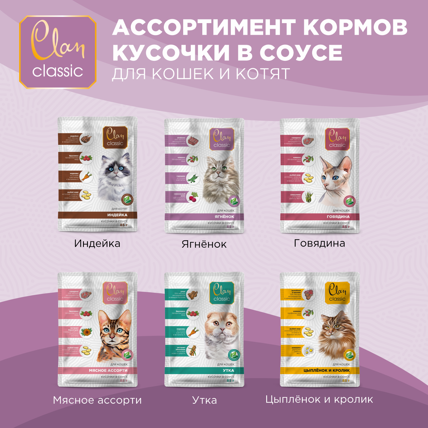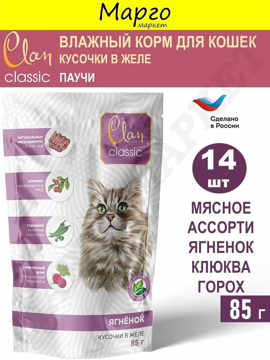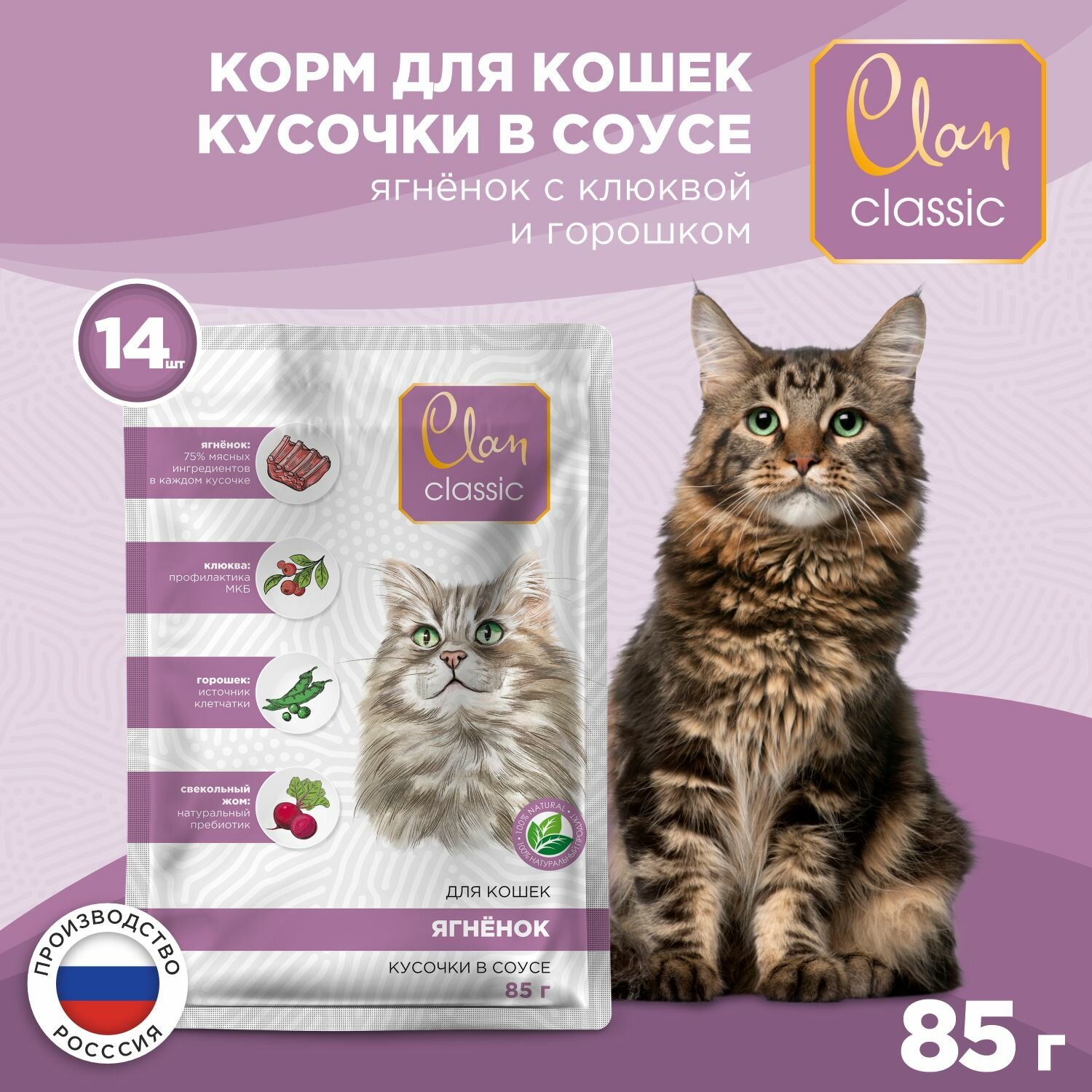 Купить Влажный корм Clan CLASSIC для кошек, мясное ассорти, ягненок, клюква, горох, кусочки в соусе, 14шт*85г