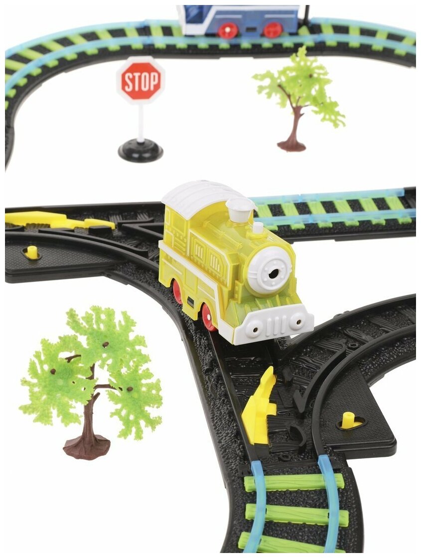 | Дополнительная информация | два паровоза, семафор; рельсы и шпалы светятся в темноте |