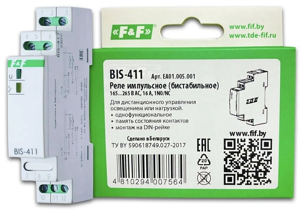 Реле импульсное BIS-411 (230В 16А 1Р монтаж на DIN-рейке 35мм) F&F евроавтоматика EA01.005.001 (1 шт.)
