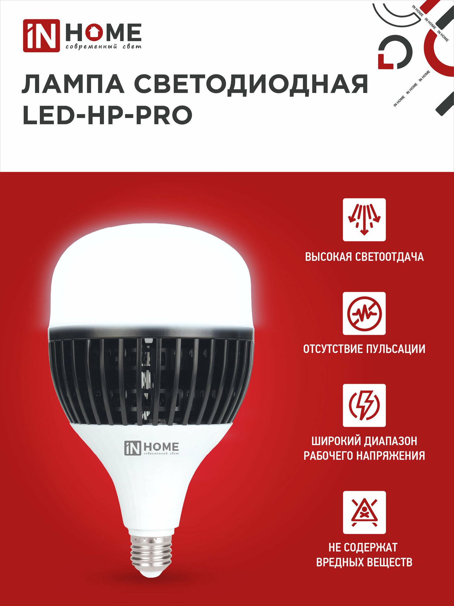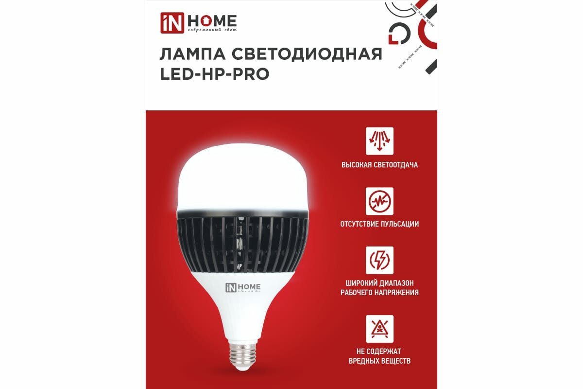 Лампа светодиодная IN HOME LED-HP-PRO, 60 Вт, 230 В, Е27, E40, 6500 К, 5700 Лм, с адаптером