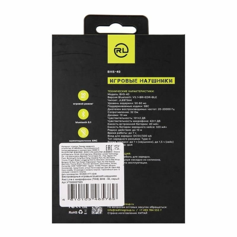 Купить Наушники беспроводные Red Line Bhs-40, Tws, BT 5.0, Type-C, 320 мАч, 101 дБ, серые Red Line 9828649