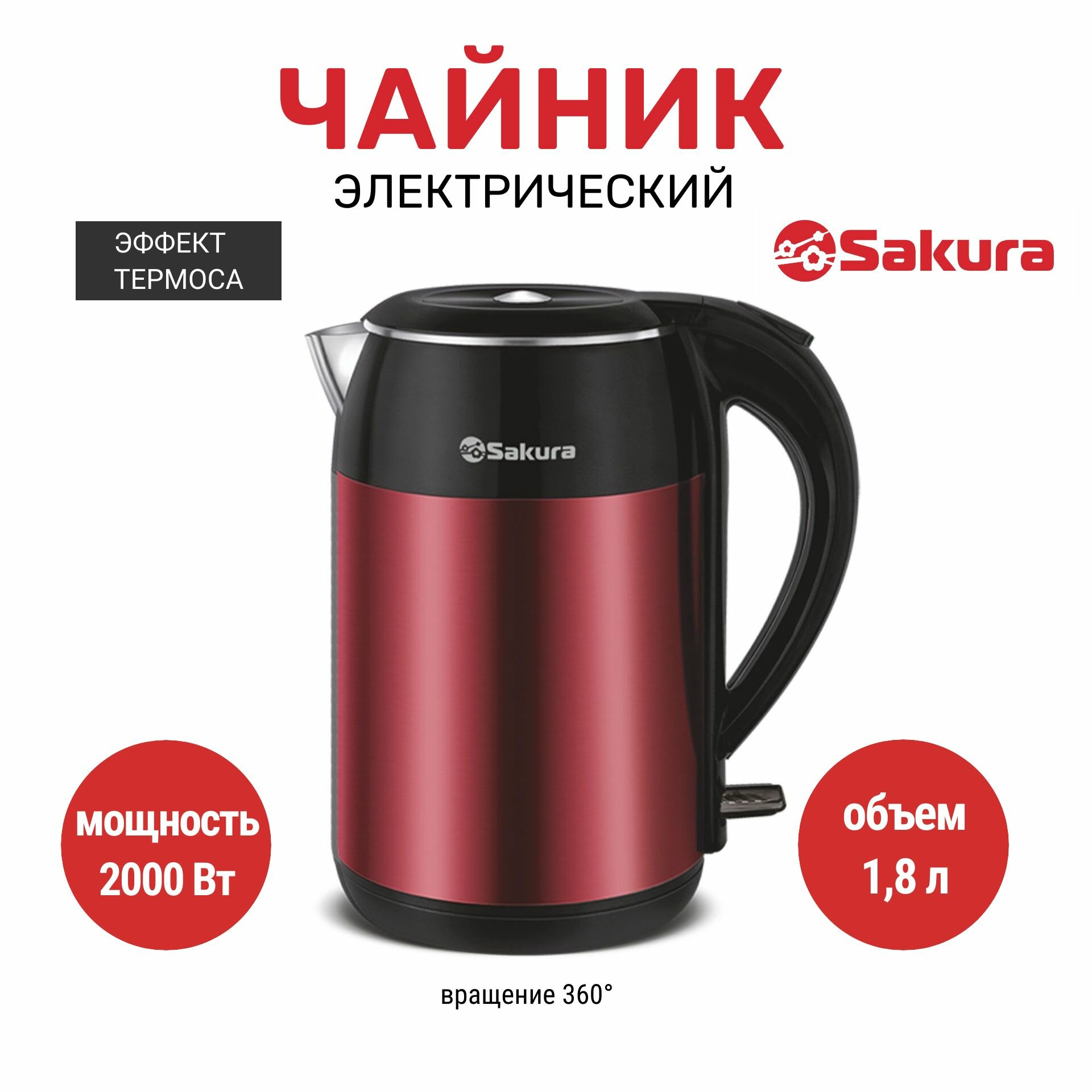 Чайник электрический SAKURA SA-2154MR 1,8л, нержавейка, красный металлик черный, двойные стенки, 1800Вт