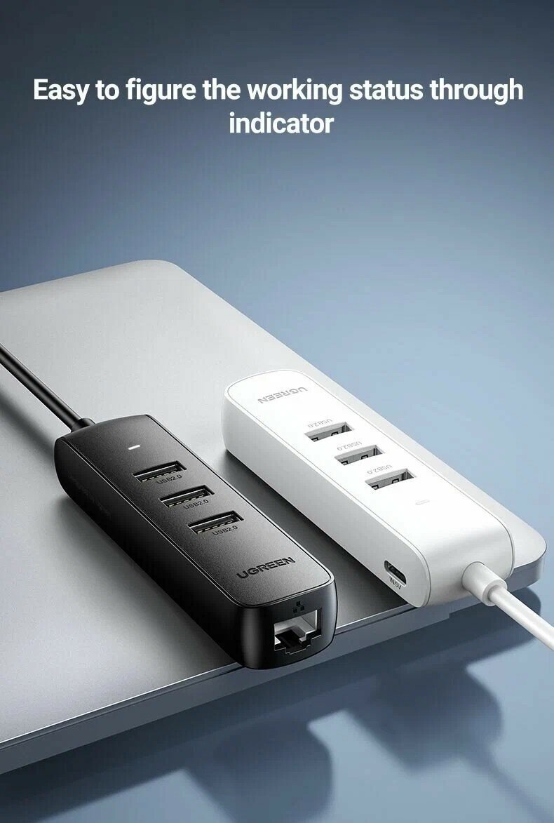 Адаптер UGREEN CM416 (20983) USB 2.0 to 3×USB 2.0 + RJ45 (10/100Mbps) Ethernet Adapter. Цвет: белый