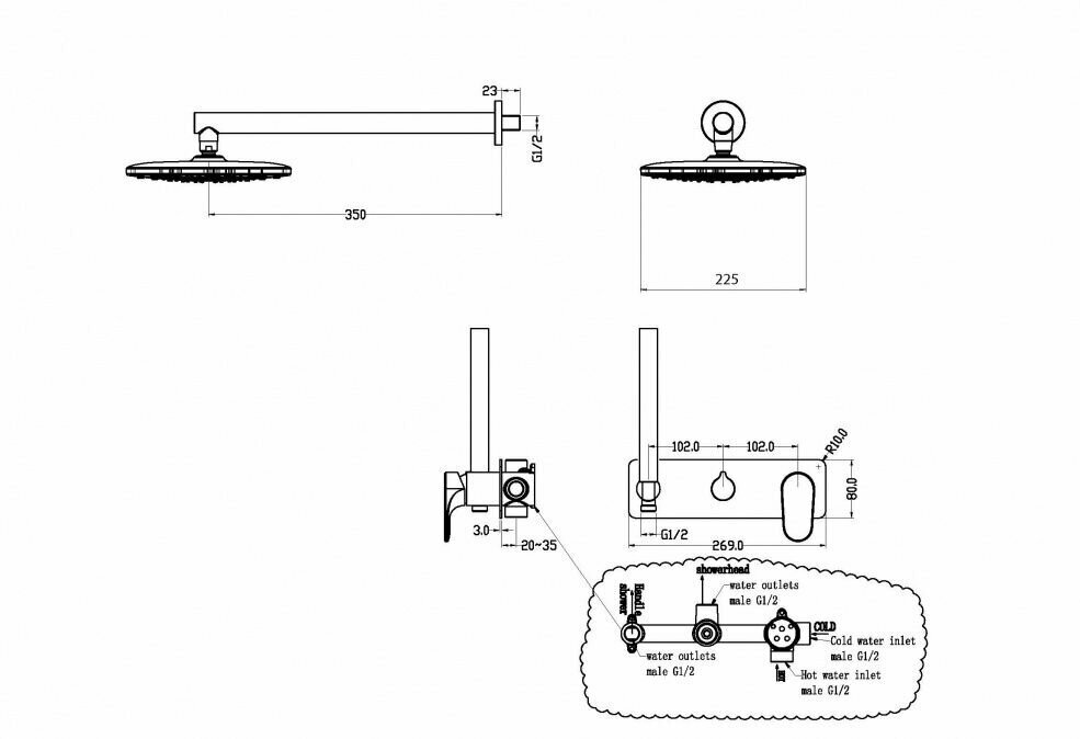 | Комплектация | Смеситель (внешняя и внутренняя части). Верхний душ. Ручной душ. Шланг для ручного душа. Держатель настенный. |