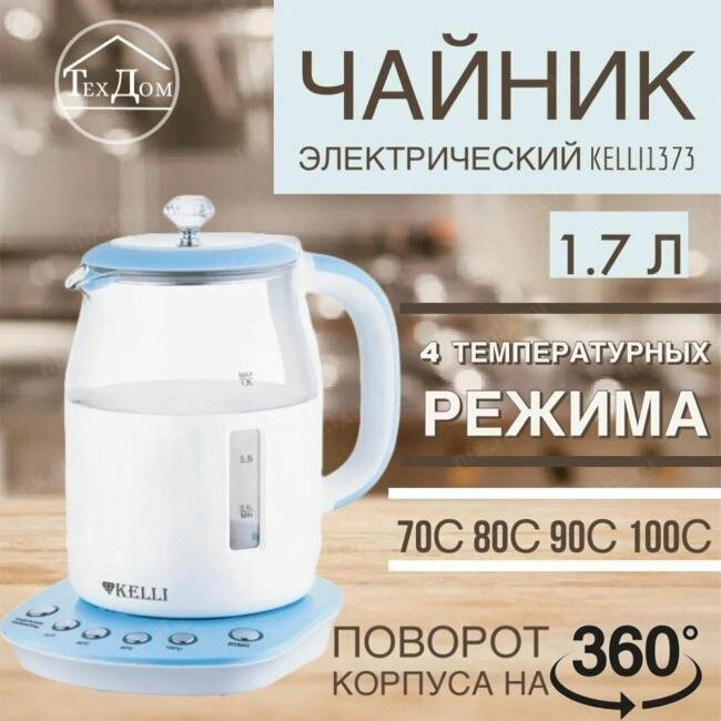 Чайник электрический Kelli KL-1373 / 1.7 л / 2200 Вт / 4 режима / стекло / бело-голубой