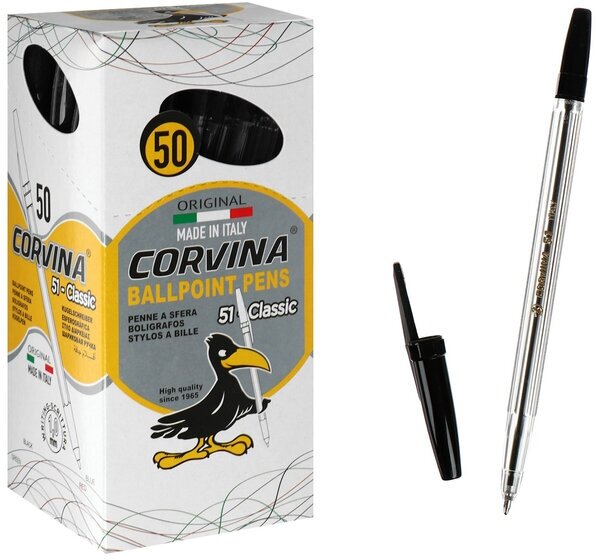 Ручка шариковая CORVINA (Италия) "51 Classic", черная, корпус прозрачный, узел 1 мм, линия письма 0,7 мм, 50 шт.