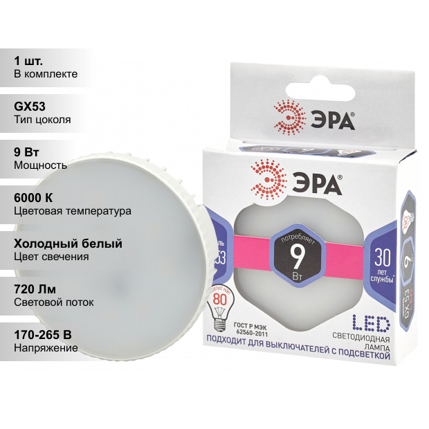 ЭРА стандарт GX53 9W(720lm) 6000K 6K 75х75 8990 (арт. 763750)