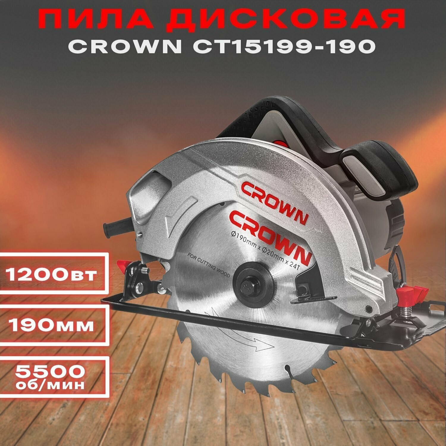 Циркулярная пила дисковая CROWN CT15199-190 (1200Вт, 5500об/мин, диск 190*20*2,0мм, 4,1кг)