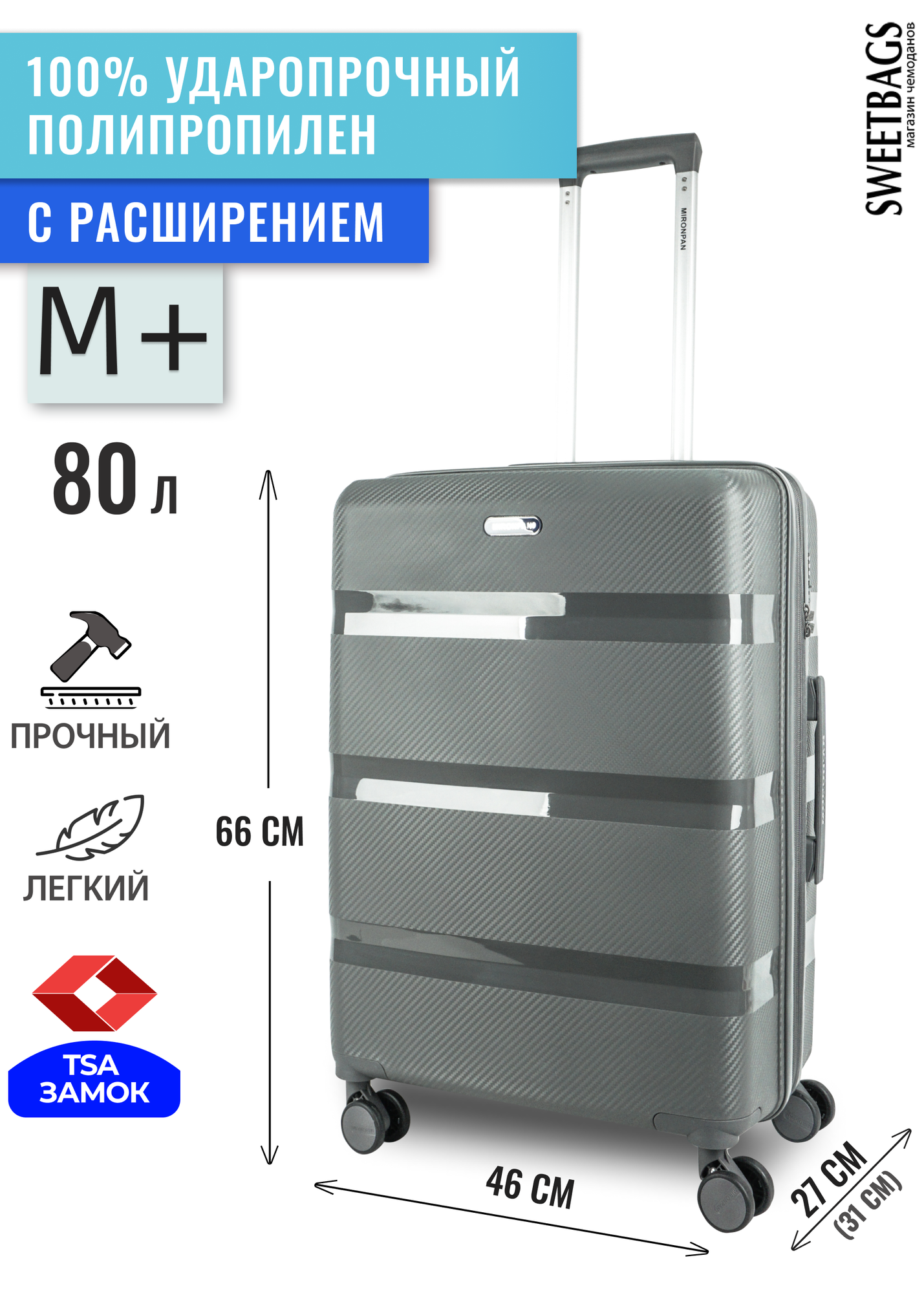 СохранитьЧемодан Sweetbags средний из полипропилена с расширением на 4-х колесах с TSA замком (3 гориз. полосы) серый M+ интересное: