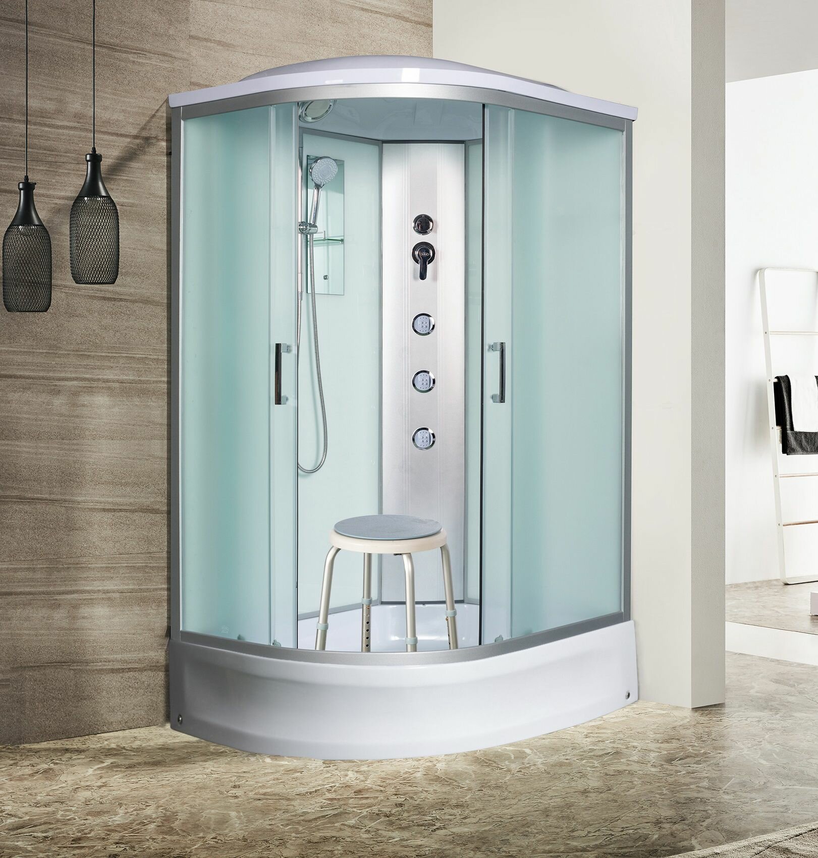 | Комплектация | душевая лейка, зеркало, поддон, сиденье |