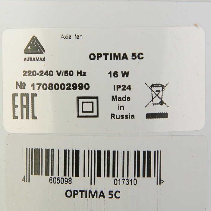 Вентилятор вытяжной AURAMAX OPTIMA 5С, 175х175 мм, d=125 мм, 220x240 В, с обратным клапаном интересное: