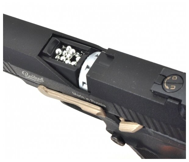 | Подробная комплектация | пистолет - 1 шт., барабан для пуль "Диаболо" - 1 шт., барабан для сферических пуль - 1 шт., шомпол - 1 шт., комплект запасных прокладок, паспорт |