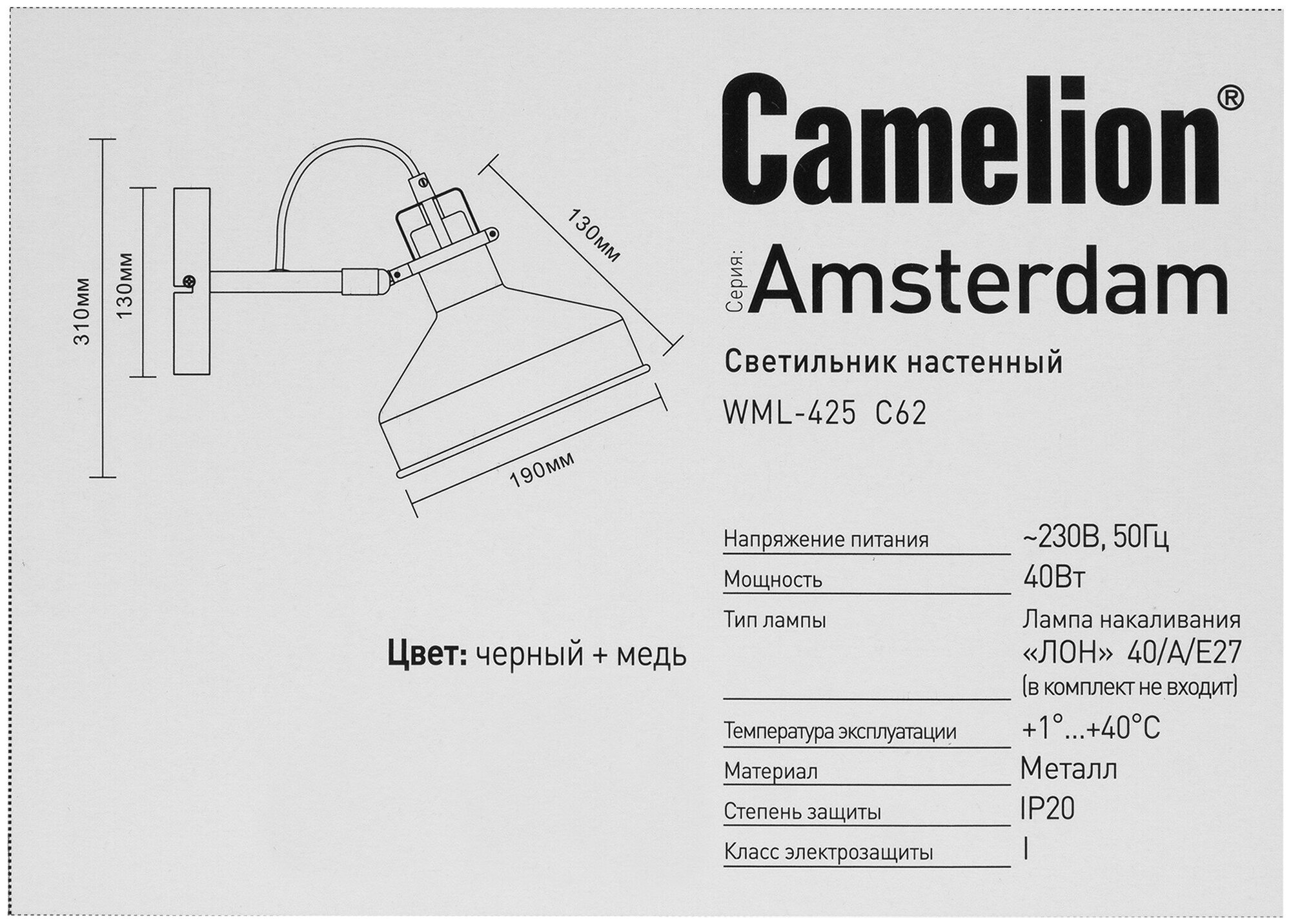черный + медь (Светильник настенный Amsterdam,1х E27, 40Вт, 230В, металл), CAMELION WML-425 C62 (1 шт.)