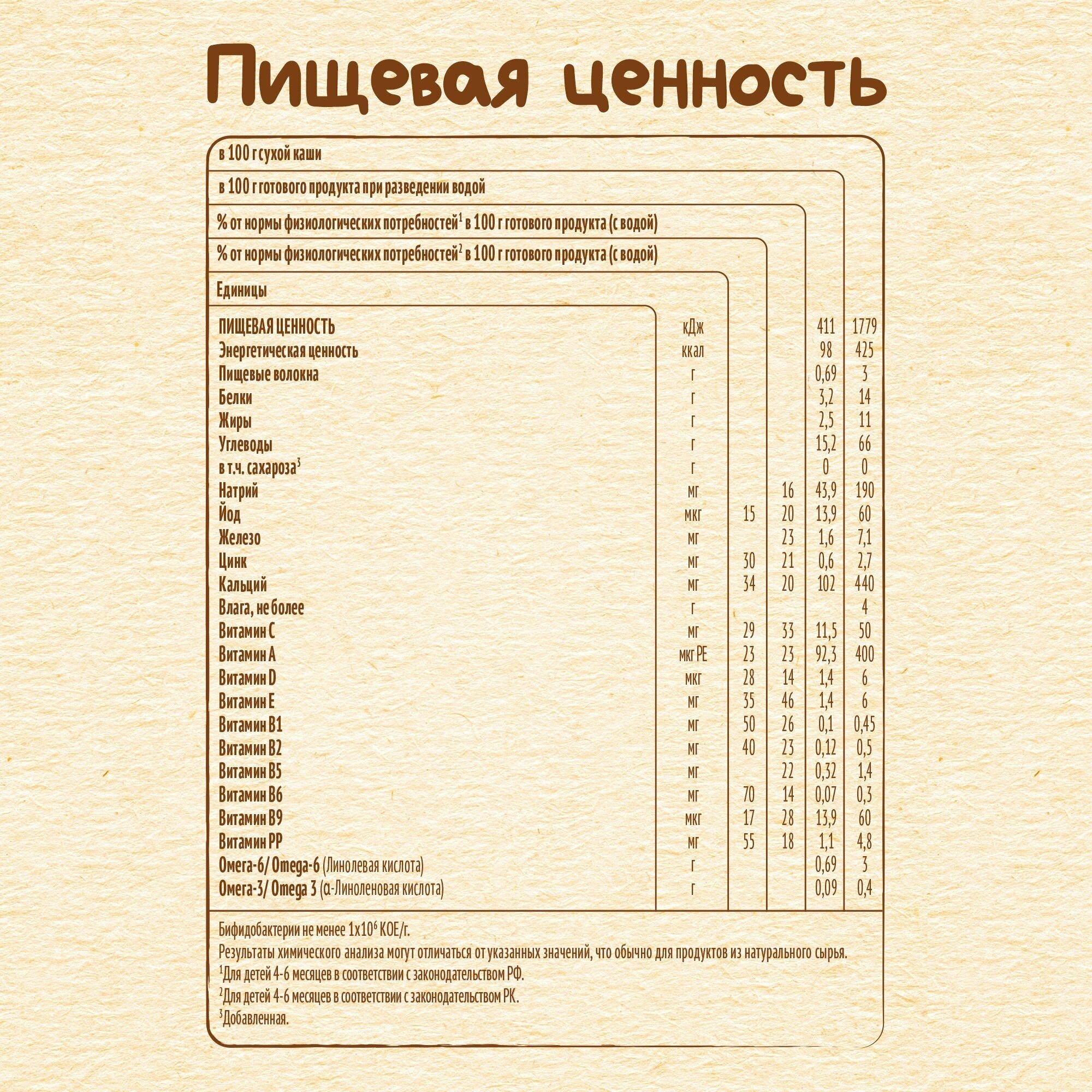 | Состав | мука (пшеничная (57%) (содержит глютен), овсяная (7,9%) (содержит глютен), рисовая (2%), кукурузная (2%)), молоко сухое обезжиренное (16,6%), смесь растительных масел (низкоэруковое рапсовое, подсолнечное высокоолеиновое, подсолнечное), антиокислители (L-аскорбилпальмитат, альфа-токоферол, лимонная кислота), хлопья банана (2,6%), хлопья яблока (1,5%), минеральные вещества (кальция карбонат, железа (II) фумарат, цинка сульфат, йодид калия), витамины (С (L-аскорбиновая кислота), E (DL-альфа-токоферола ацетат), РР (никотинамид), B5 (D-пантотенат кальция), A (ретинола ацетат), В1 (тиамина мононитрат), В6 (пиридоксин гидрохлорид), В2 (рибофлавин), B9 ( фолиевая кислота), D (D3 холекальциферол)), бифидобактерии не менее 1х10^6 КОЕ/г |