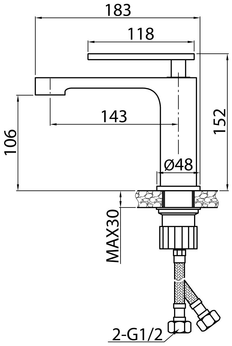 | Комплектация | Смеситель, набор крепежа для установки смесителя, 2 гибких шланга для подвода воды |
