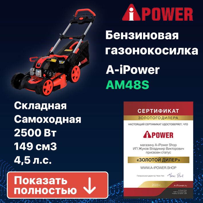СохранитьГазонокосилка бензиновая самоходная складная A-iPower AM48S мощность 4.5 л. с. интересное: