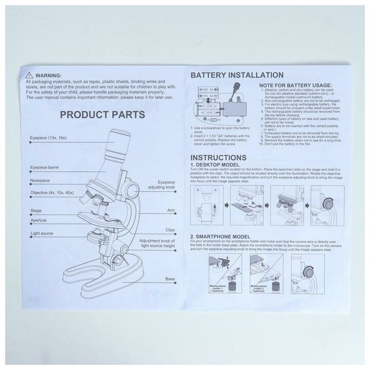 Микроскоп, кратность увеличения 900х, 600х, 300х, 100х, с подсветкой, набор для исследований