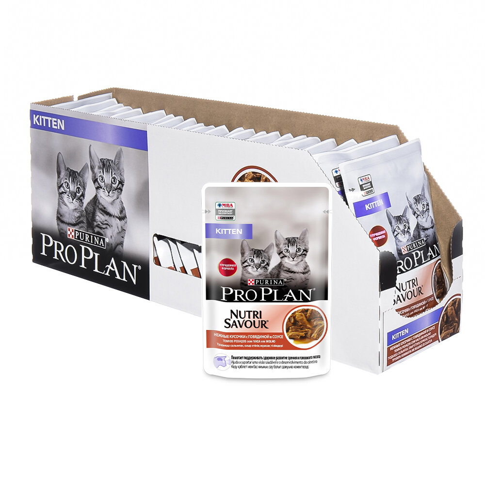 Влажный корм для котят Pro Plan Nutri Savour Kitten, с говядиной в соусе, Пауч, 85 г. Цена за упаковке,в упаковке 12шт (12штх85г).
