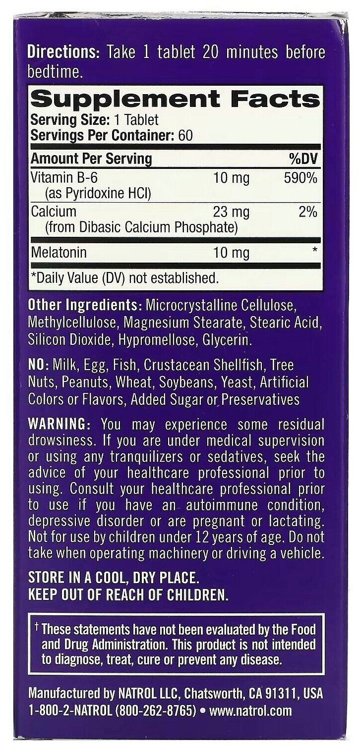 | Состав | витамин B6 - 10 мг, кальций (из двузамещенного фосфата кальция) - 23 мг, мелатонин - 10 мг, микрокристаллическая целлюлоза, метилцеллюлоза, стеарат магния, стеариновая кислота, диоксид кремния, гипромеллоза, глицерин |