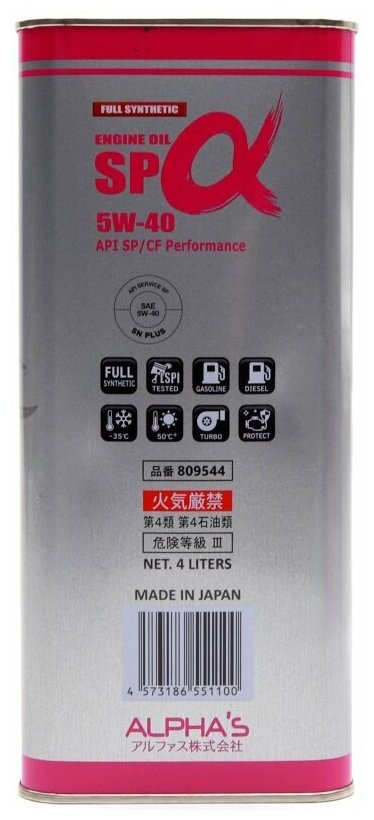 Масло моторное ALPHA'S 5w40 синтетическое, SN PLUS/SP/CF, для бензинового двигателя, 4л, арт. 809544