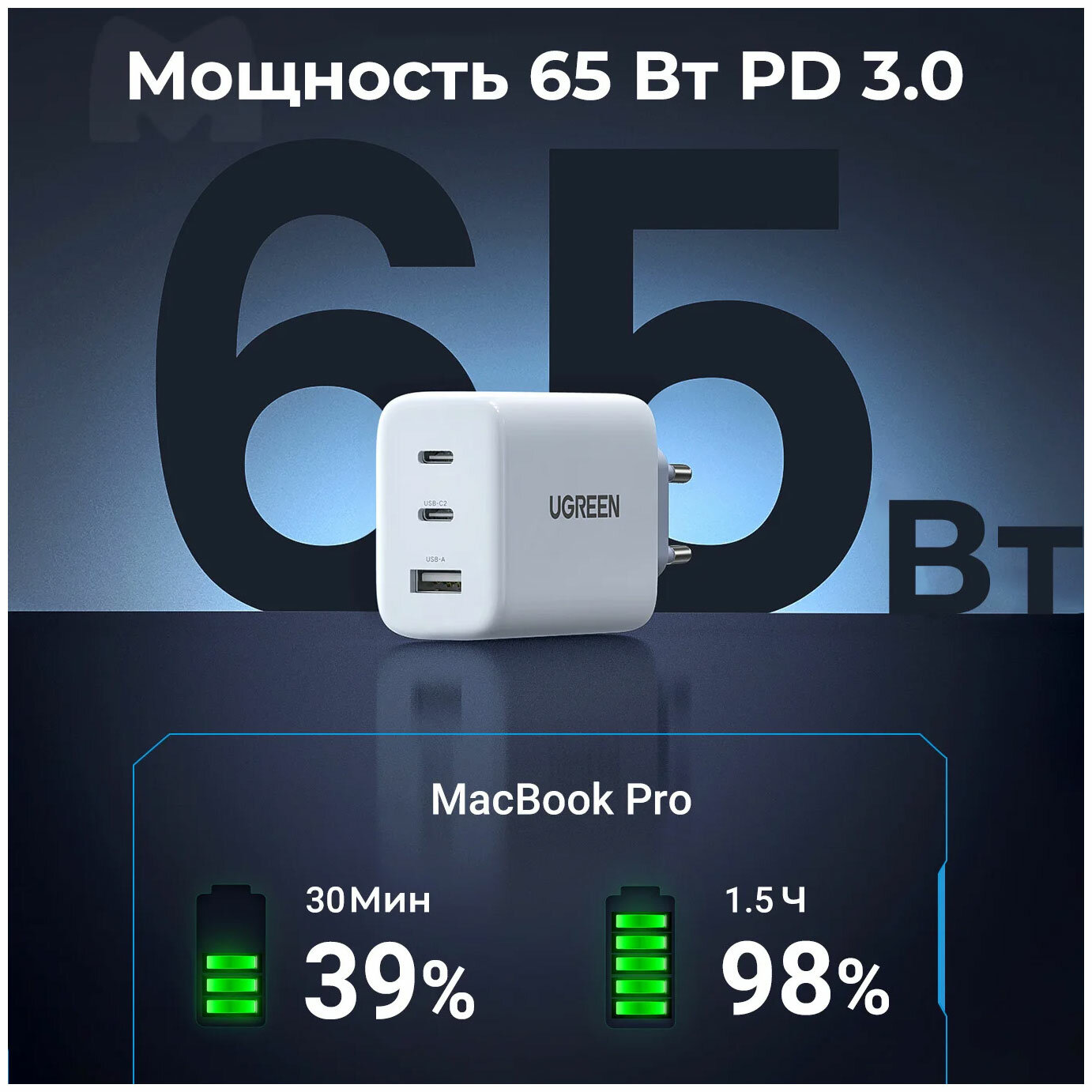 СохранитьСетевое зарядное устройство Ugreen CD 275 USB-A+2ХUSB-C, 65W, цвет белый (90496) интересное:
