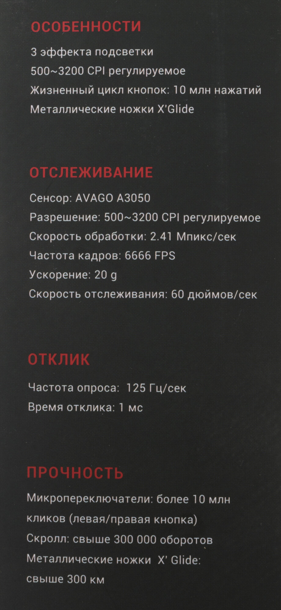| Дополнительная информация | 500/1000/1200/1600/2000/3200 dpi; подсветка корпуса. x glide pro; металлические ножки |