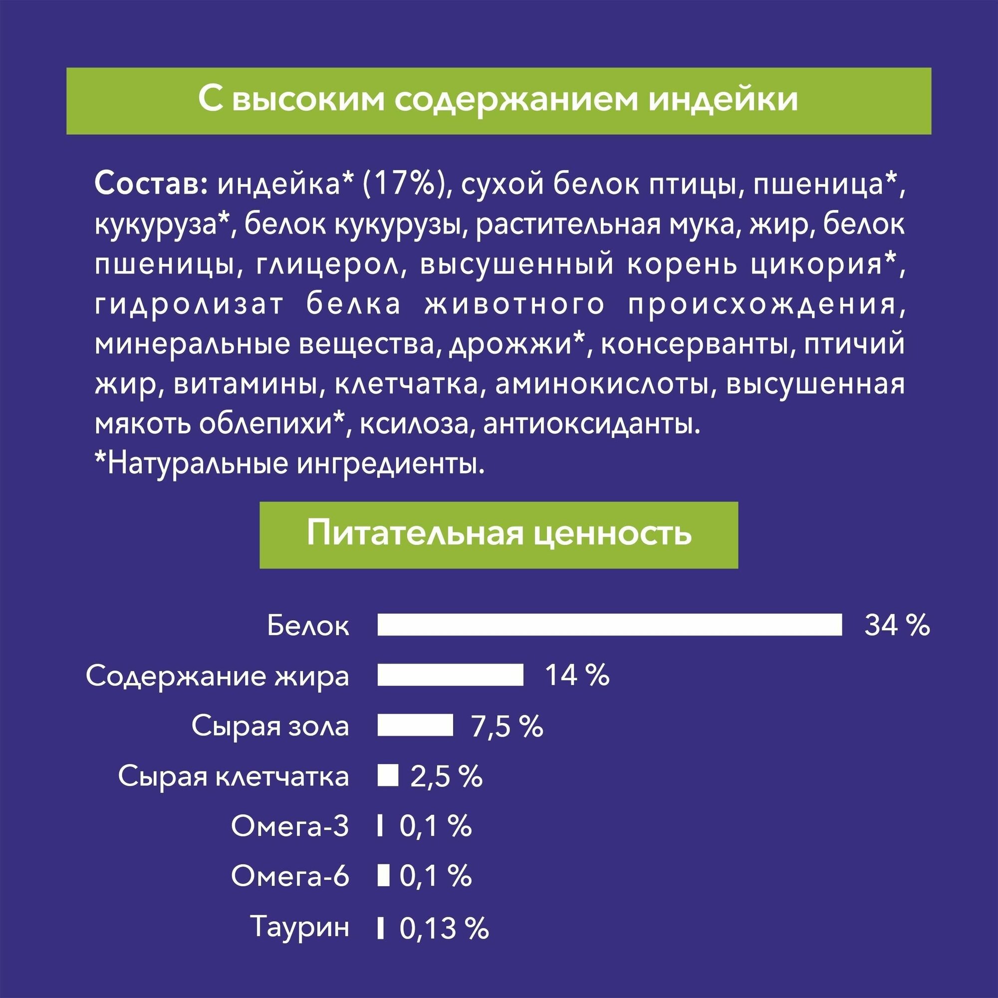 | Состав | индейка* (17%), сухой белок птицы, пшеница*, кукуруза*, белок кукурузы, растительная мука, жир, белок пшеницы, глицерол, высушенный корень цикория*, гидролизат белка животного происхождения, минеральные вещества, дрожжи*, консерванты, птичий жир, витамины, клетчатка, аминокислоты, высушенная мякоть облепихи*, ксилоза, антиоксиданты. *Натуральные ингредиенты |